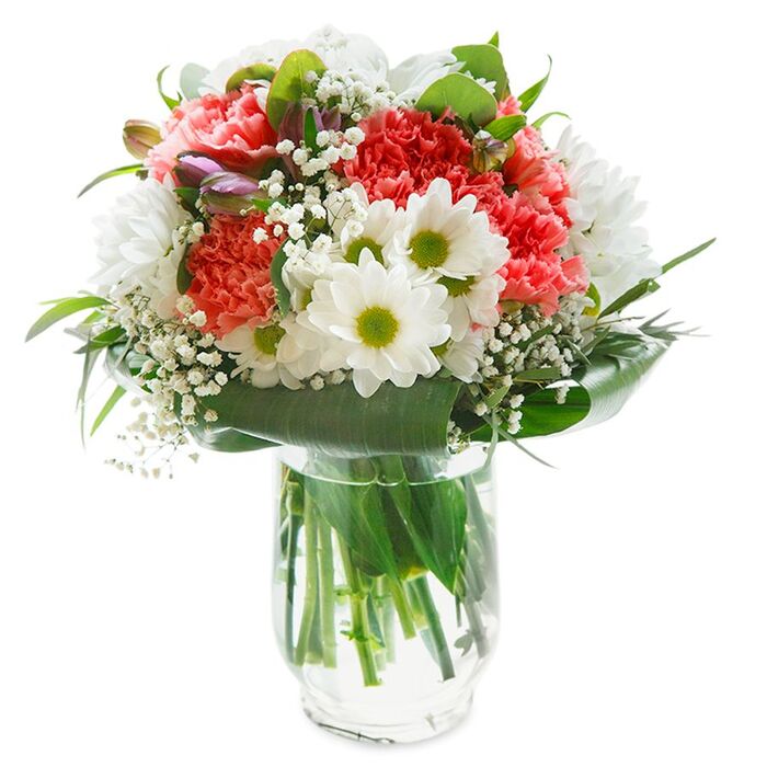 Introducing our luxurious seasonal flower arrangement – a veritable celebration of nature’s most elegant creations. This bouquet boasts an inspiring blend of white chrysanthemums, gypsophila, and light pink carnations artfully intertwined with elegant aspidistra leaves.